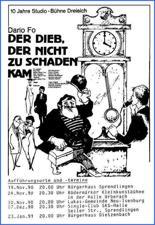 Regie: Renate Rauffmann Der Einakter "Der Dieb, der nicht zu schaden kam" entstand Anfang der 60er Jahre, als es in Italien noch keine Ehescheidung gab: Ein Dieb bricht bei einem reichen Italiener ein und erwischt den Hausherrn mit seiner Geliebten. Nach und nach wird die verlogene Doppelmoral des angesehenen Bürgers bloßgestellt, und nach turbulenten Ereignissen stellt sich heraus, daß der Ganove und dessen Frau die einzigen sind, die ohne Lug und Betrug ein sozusagen ehrliches Leben miteinander führen. Mitwirkende: