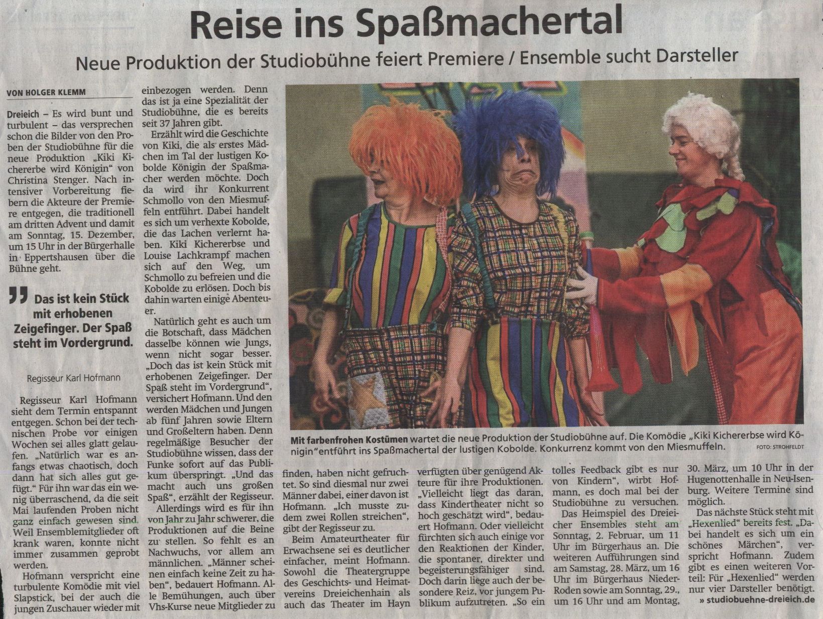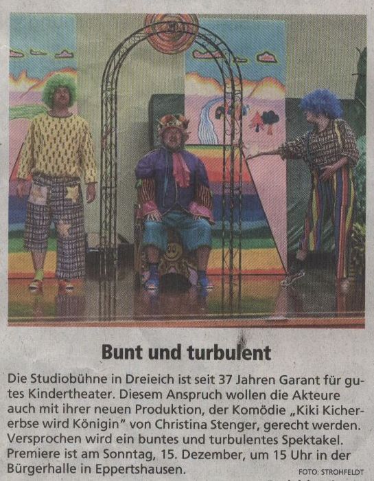 Regie: Karl Hofmann Kiki Kichererbse hat sich ein besonderes Ziel gesetzt: Das Witzboldjahr ist bald um und die neue Wahl steht an. König Willy Witzbolds Zeit ist vorbei, und Schmollo Schmunzel macht sich Hoffnungen auf die Nachfolge. Aber Kiki möchte die erste Königin der Spaßmacher werden – und im direkten Wettkampf schlägt sie ihren Konkurrenten. Aber Schmollo gibt seinen Kampf nicht auf. Als er die Krone stehlen will, wird er von den Miesmuffels entführt. Die Miesmuffels sind ehemalige Kobolde, die verhext wurden und nun das Lachen verlernt haben. Kiki Kichererbse und Louis Lachkrampf brechen auf, um Schmollo zu befreien und die Kobolde zu erlösen ... Eine liebevolle, turbulente Inszenierung mit viel Witz und Schwung, tollen Kulissen und schöne Kostüme – die Markenzeichen der StudioBühne - werden die Kinder begeistern. Witzige Dialoge und schräge Charaktere sorgen immer wieder für überraschende Wendungen und die Rollen werden das Publikum erfreuen. Wie Sie es von der StudioBühne kennen und schätzen, werden wir auch diesmal die kleinen und großen Zuschauer kräftig in die Handlung mit einbinden. Termine: